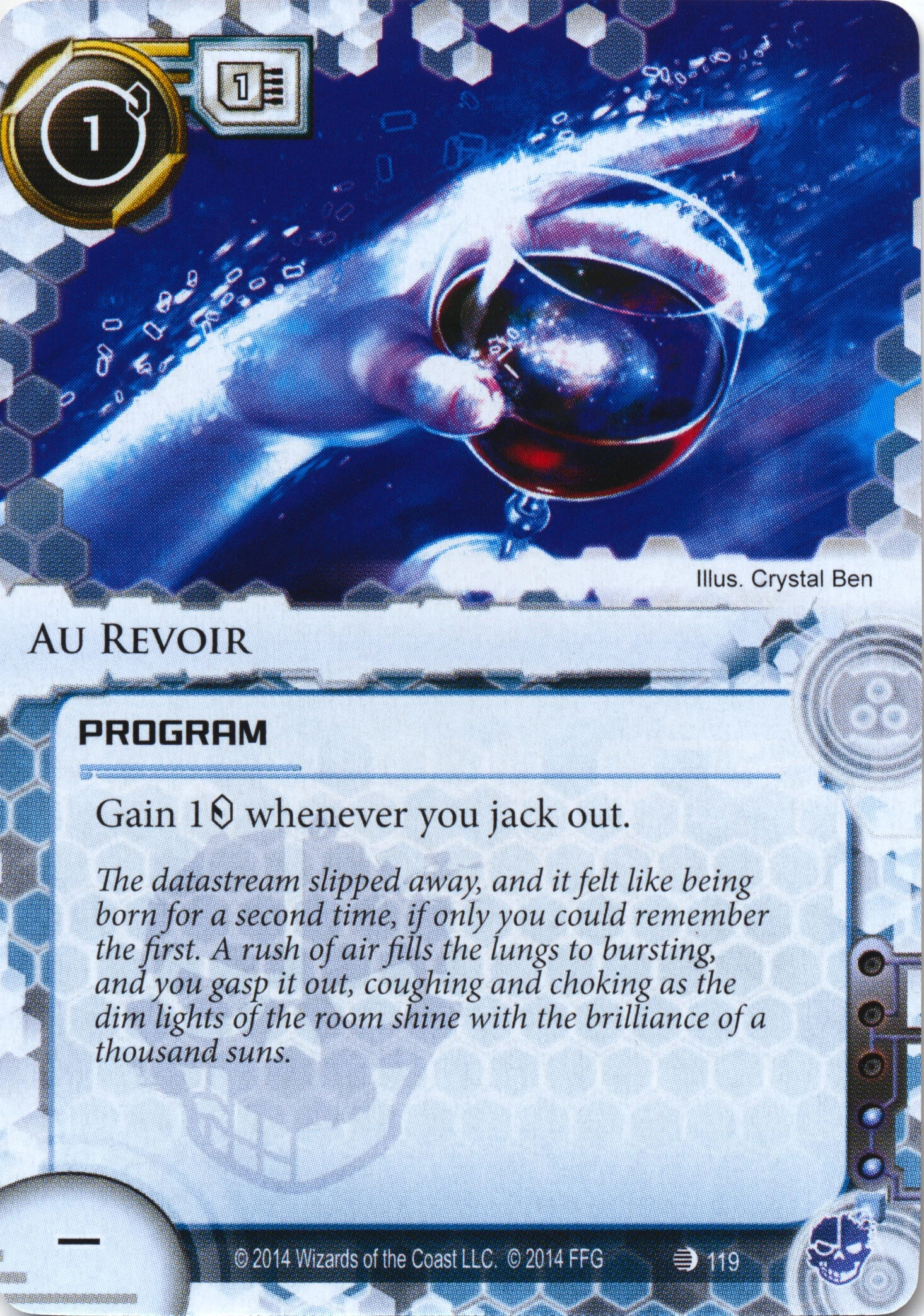 | The datastream slipped away, and it felt like being born for a second time, if only you could remember the first. A rush of air fills the lungs to bursting, and you gasp it out, coughing and choking as the dim lights of the room shine with the brilliance of a thousands suns. |