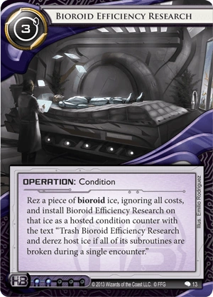 | Rez a piece of bioroid ice, ignoring all costs, and install Bioroid Efficiency Research on that ice as a hosted condition counter with the text "Trash Bioroid Efficiency Research and derez host ice if all of its subroutines are broken during a single encounter." | |
