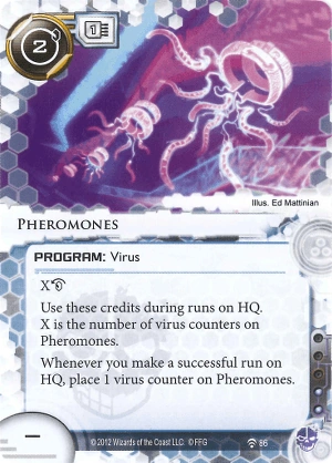 | X Use these credits during runs on HQ. X is the number of virus counters on Pheromones. Whenever you make a successful run on HQ, place 1 virus counter on Pheromones. | |